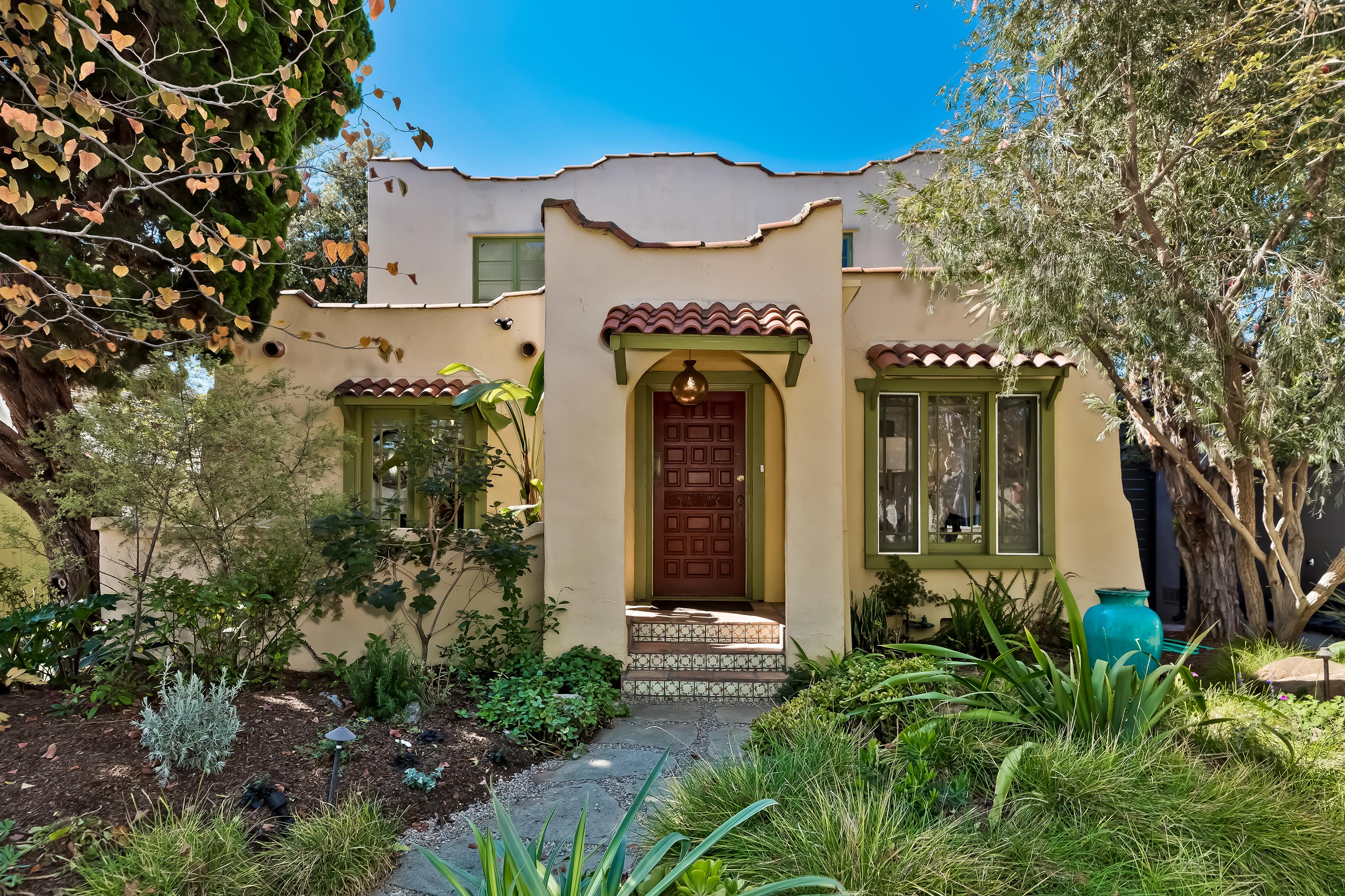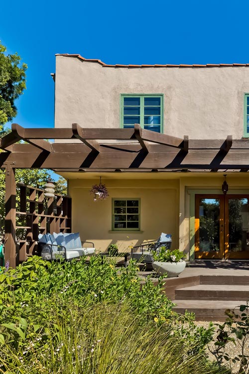 Enchanting Spanish home and wild gardens welcome you. Spacious floor plan with 3 bedrooms upstairs and 1 bedroom plus an office down. Upstairs is added with taste and attention, complementing the original design. The original dining room with French doors open to a lovely secluded patio. An updated warm kitchen opens to a large light filled family room with a fireplace, that opens to a fabulous entertaining deck and beautifully landscaped yard with a trickling fountain. Relax and Entertain in the lovely outdoor dining area. This home is fabulous for a growing family or person(s) that seek privacy and space . Do not miss this opportunity to own on a fabulous home that is walking distance to schools and biking to the beach. House is being sold "as is". Calming fountains and potted plants are included.